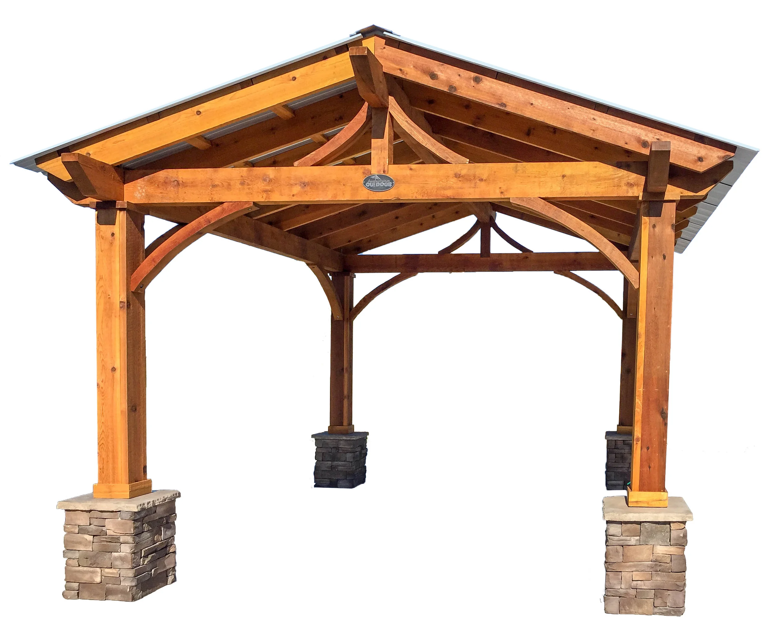 The pavilion pergola with a metal roof option provides protection from the elements and a large shade island. The gentle slope of the roof-line is angled at a 4/12 pitch with an overall height of 10’-12’ at the peak depending on the size of the pergola.
